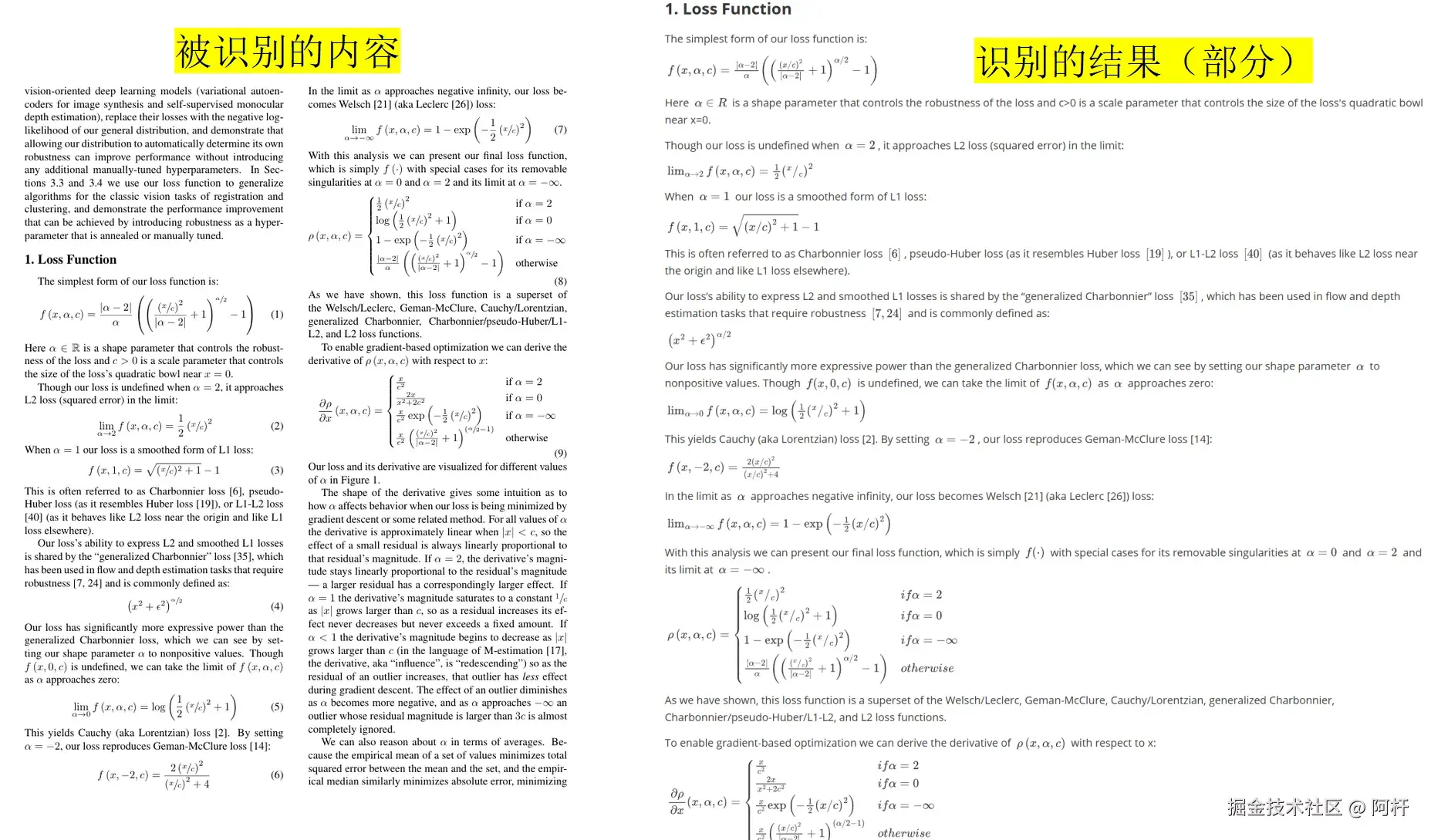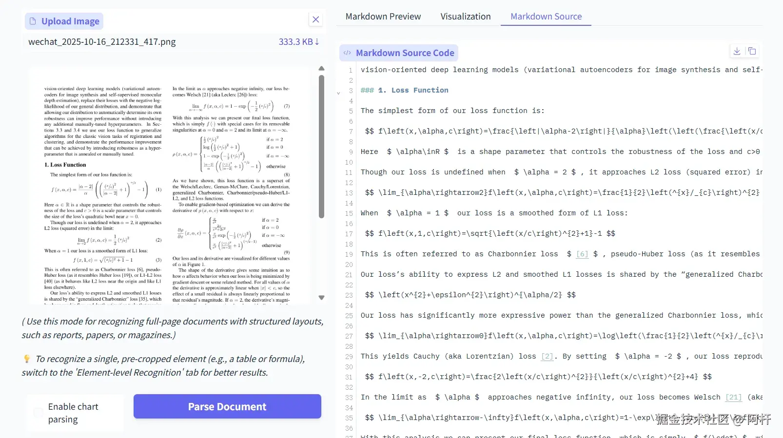 PaddleOCR-VL 的输出结果简直让人惊讶,公式被准确地渲染成 LaTeX 格式,图表标题与正文自动分区,还能识别左右排版并按照阅读顺序进行了输出。