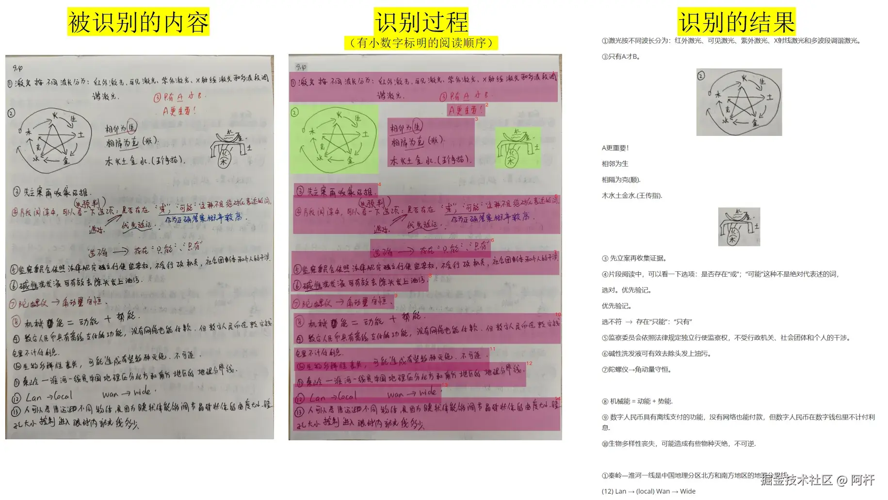 最后我拿出了一叠来自某位考公人的手写笔记,OCR 的噩梦素材:歪斜的字、不规则的图、重叠的笔迹、模糊的边角。