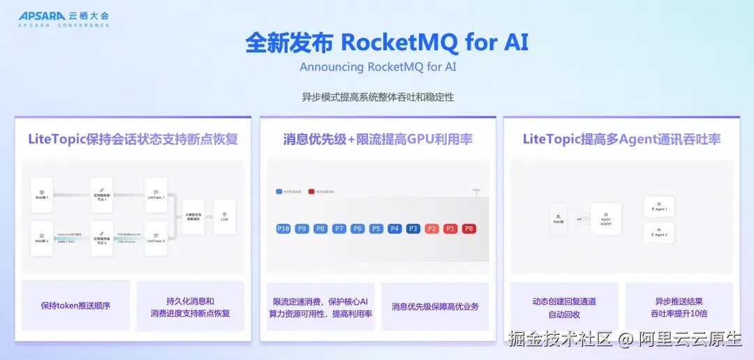 这一创新架构的实现,依托于 RocketMQ 为 AI 场景深度优化的四大核心能力: