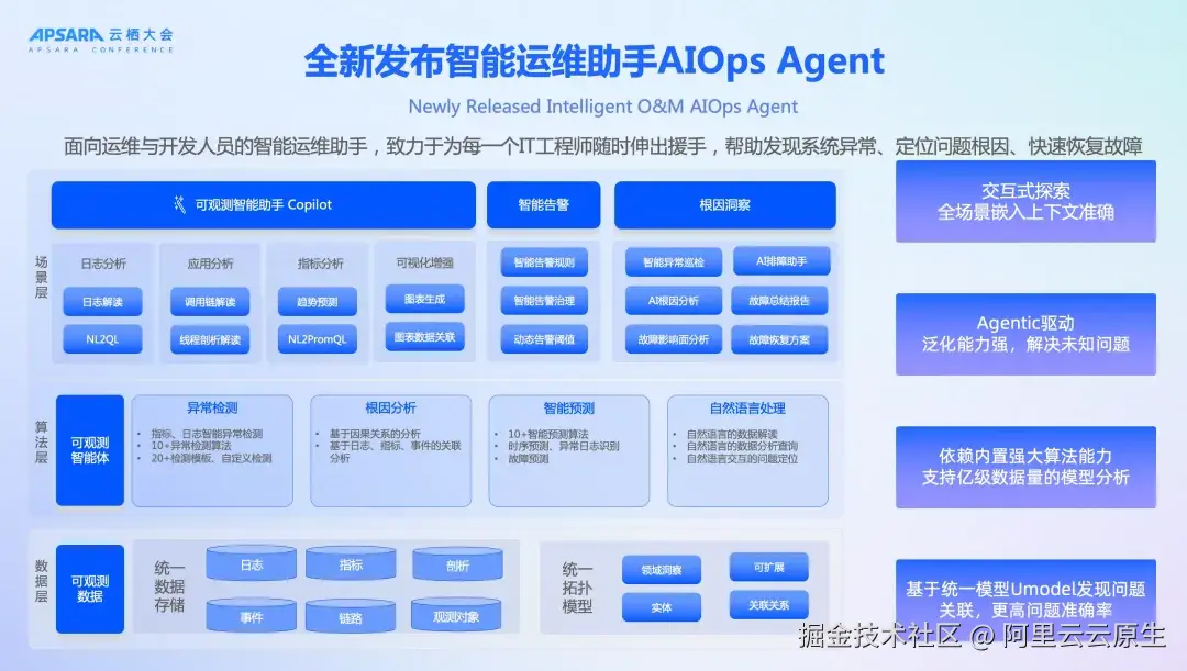 与传统的基于规则的 AIOps 不同,我们的 AIOps 智能体基于多 Agent 架构,具备解决未知问题的自主性。在收到问题后,它会自主地进行规划、执行和反思,从而提升解决问题的能力。在算法层面,我们积累了非常多的原子能力,这些原子包括对海量数据的预处理,异常检测,智能预测等算子,这些都可以作为工具可以被智能体使用。也欢迎大家可以登录我们的控制台进行体验并给我们反馈。