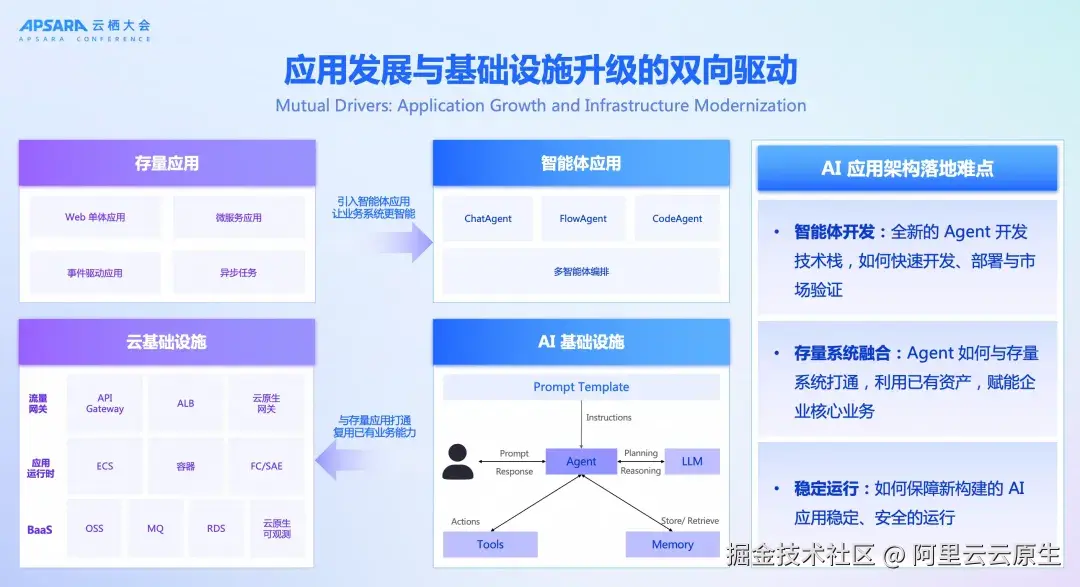 - 应用拉动基础设施升级: 智能体应用引入了全新的负载形态:推理计算的实时性、长会话的状态保持、多模态的交互需求,以及对安全、稳定、成本的极致追求。这些要求远远超出了传统云计算的假设,迫使基础设施从资源池化走向智能化:算力需要具备毫秒级弹性、运行时需要具备安全隔离和 session 亲和、通信层需要支持异步与高吞吐,甚至消息队列、存储和网关都要具备 AI 场景感知能力。可以说,应用的需求直接塑造了基础设施的形态。