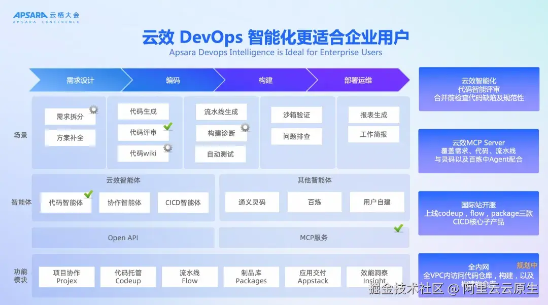 到这里,AI 原生架构已经基本覆盖智能体快速开发与部署、智能体与存量系统融合以及智能体的稳定运行,但距离真正的规模化落地还差"最后一公里"。也就是如何将这套全新的智能体开发范式融入到企业现有的 DevOps 流程。