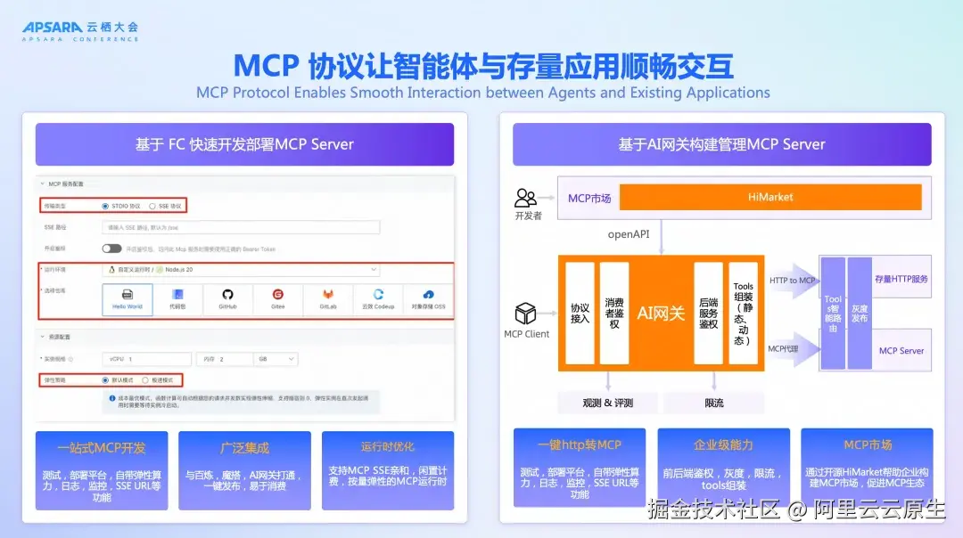 除了打通存量系统,企业还需要不断构建新的智能体工具,尤其是基于 MCP(Model Context Protocol)这一新兴标准协议。但难题在于,如何快速开发、部署和管理 MCP Server,使其能够与智能体无缝衔接。如果缺乏高效的开发运行环境,企业在创建 MCP Server 时往往面临资源准备复杂、部署周期长、难以保证弹性与安全的问题。