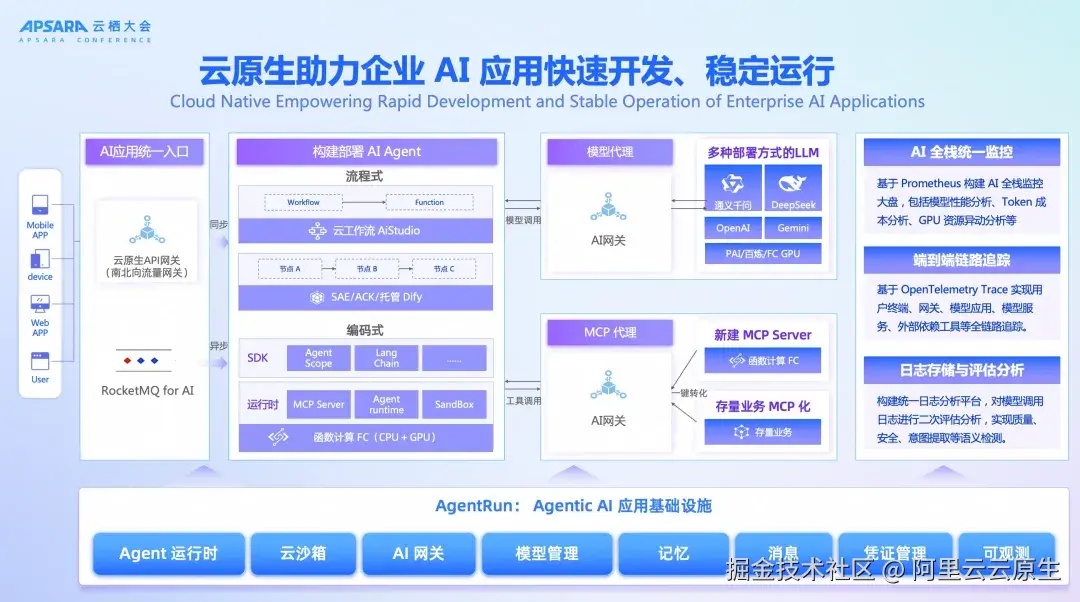 这些问题的解决,需要云基础设施从传统形态升级为 AI 原生架构。AI 基础设施的核心要素包括:具备毫秒级弹性的函数计算运行时、统一流量治理与协议适配的 AI 网关、支撑异步高吞吐通信的消息中间件,以及覆盖模型调用、智能体编排和系统交互的全栈可观测体系。只有在这一新型基础设施的支撑下,智能体应用才能真正成为企业应用架构的"新基建",推动业务持续智能化升级。
