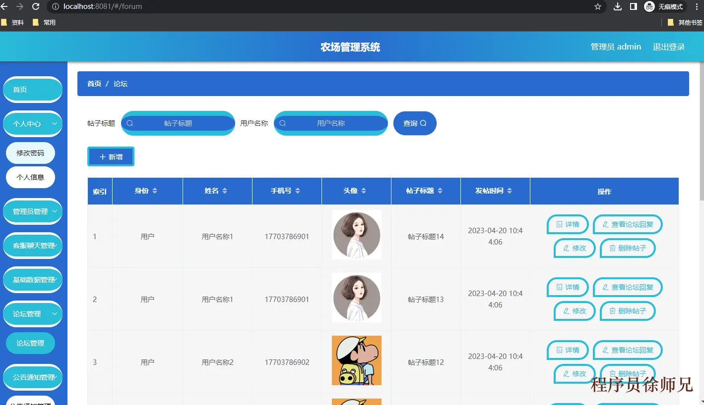 如图4.4显示的就是论坛信息管理页面,此页面提供给管理员的功能有:根据论坛信息进行新增、修改、查询操作等等。