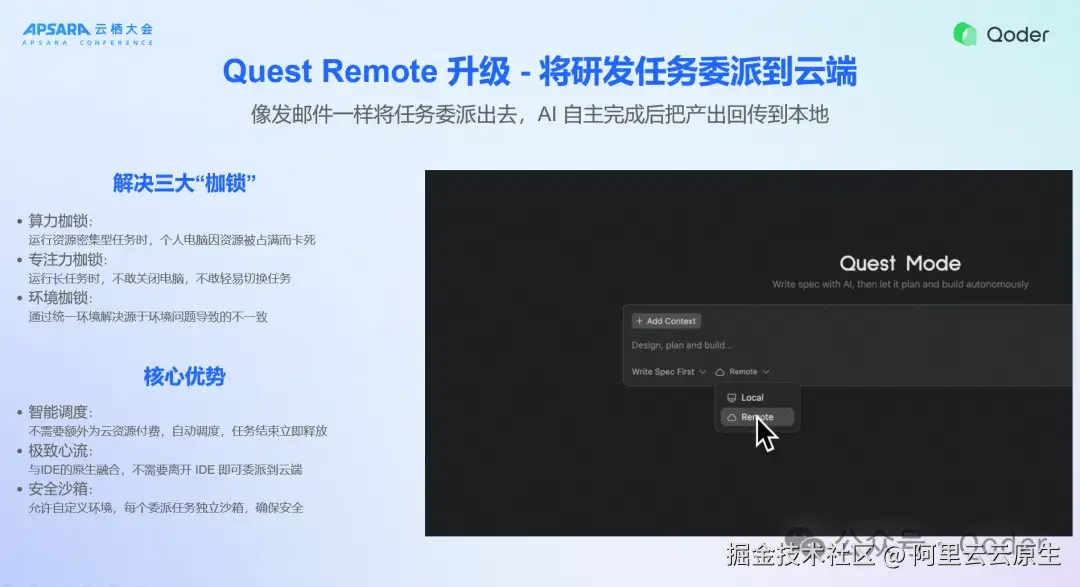 今天,在 2025 云栖大会的现场,Qoder 负责人丁宇宣布,Qoder 核心功能 Quest 模式迎来里程碑式升级,推出全新的"远程委派"功能,允许开发者将复杂的、耗时的开发任务一键委派至云端沙箱环境中异步执行,彻底解放本地计算资源,为全球开发者带来高效与安全的 AI 原生开发体验。