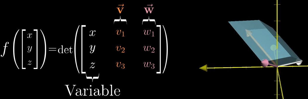 三维空间:对于矩阵 A = [ a b c d e f g h i ] A = \begin {bmatrix} a & b & c \\ d & e & f \\ g & h & i \end {bmatrix} A= adgbehcfi ,其行列式为 det ( A ) = a ( e i − f h ) − b ( d i − f g ) + c ( d h − e g ) \det (A) = a (ei - fh) - b (di - fg) + c (dh - eg) det(A)=a(ei−fh)−b(di−fg)+c(dh−eg),几何意义是 "标准基 { ı ^ , ȷ ^ , k ^ } \{\hat {\imath}, \hat {\jmath}, \hat {k}\} {^,^,k^} 构成的单位立方体,经 A A A 变换后形成的平行六面体的体积"。