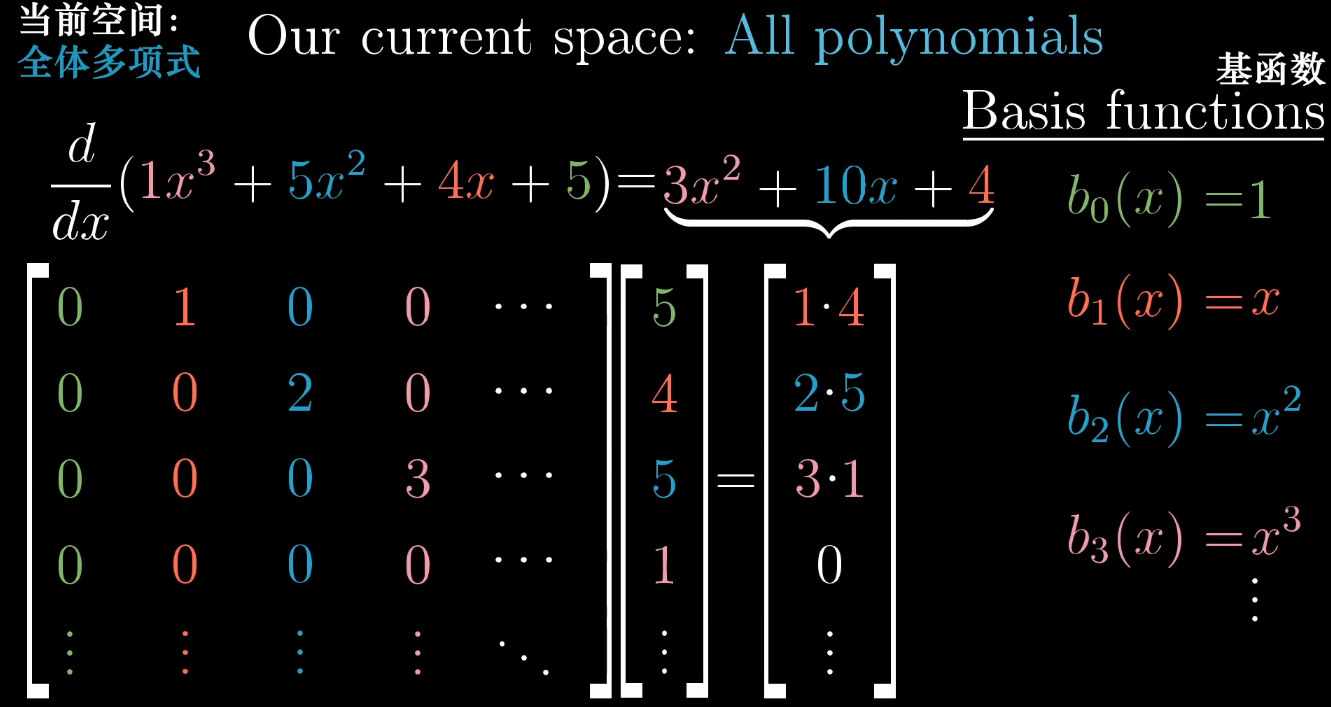 以多项式函数为例,可通过矩阵描述求导变换。选取幂函数 { 1 , x , x 2 , x 3 , ... } \{1, x, x^2, x^3, \dots\} {1,x,x2,x3,...} 作为基函数(对应向量空间的基向量),则求导操作可表示为矩阵形式,进一步验证"矩阵是变换的数字表达"这一关键观点。