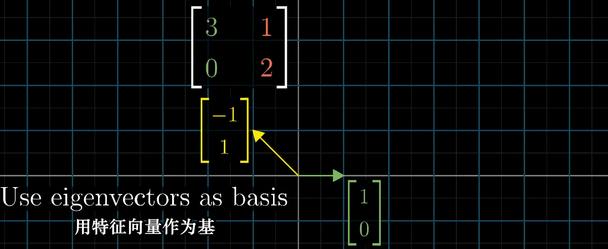 - 变换中留在自身张成空间内的向量,称为特征向量 (如 x x x 轴上的向量、 ( − 1 , 1 ) (-1, 1) (−1,1));