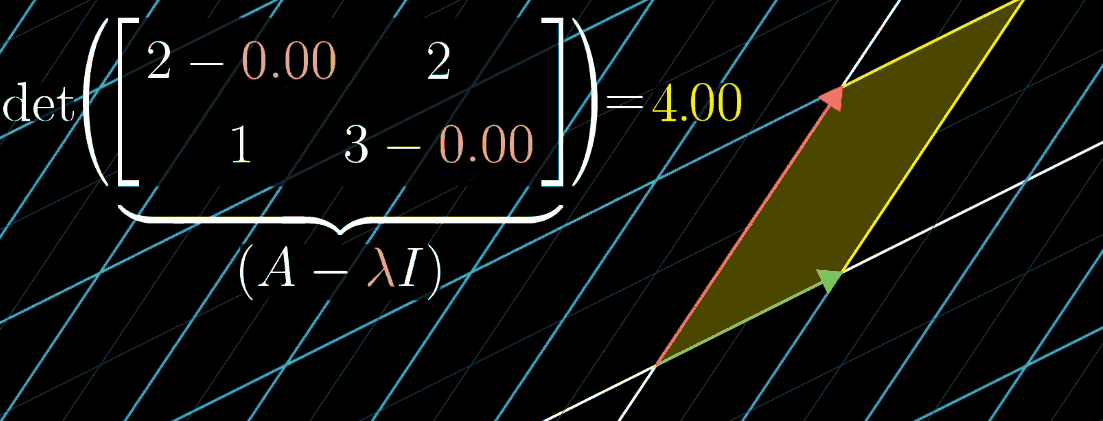 如图所示,随 λ \lambda λ 变化可可视化这一计算过程。例如矩阵 A = [ 2 2 1 3 ] A = \begin{bmatrix} 2 & 2 \\ 1 & 3 \end{bmatrix} A=[2123],其特征值之一为 1。