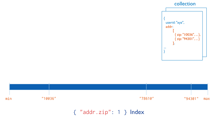 无需显式指定多键类型。当您创建 包含数组值的字段上的索引,MongoDB 自动 将索引设置为多键索引。