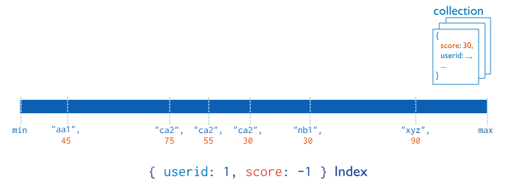 例如,下图显示了一个复合索引,其中文档 首先按升序(按字母顺序)排序。 然后,for each 按降序排序: