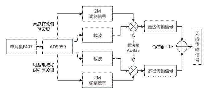 以STM32F407为控制核心,结合AD9959模块构成DDS系统,设计制作了无线传输信号模拟系统。系统包含三电阻网络构成的合路器、AD835乘法器、数字衰减器PE43902、模拟开关电路。STM32F407驱动AD9959模块输出思路信号,分别为两路调制信号、两路载波;两路载波分别经过一个合路器,加上直流偏置;随后两路载波分别与2Mhz的正弦调制信号通过乘法器AD835进行混频,得到直达传输信号和多径传输信号;多径传输信号通过衰减器后,与直达传输信号通过合路器得到无线传输信号。
