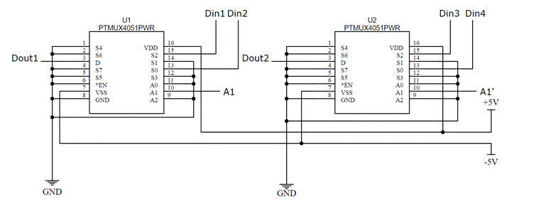本题我们采用TMUX4051芯片,搭建模拟开关电路,通过单片机控制TMUX4051的地址段,来控制波形输出。