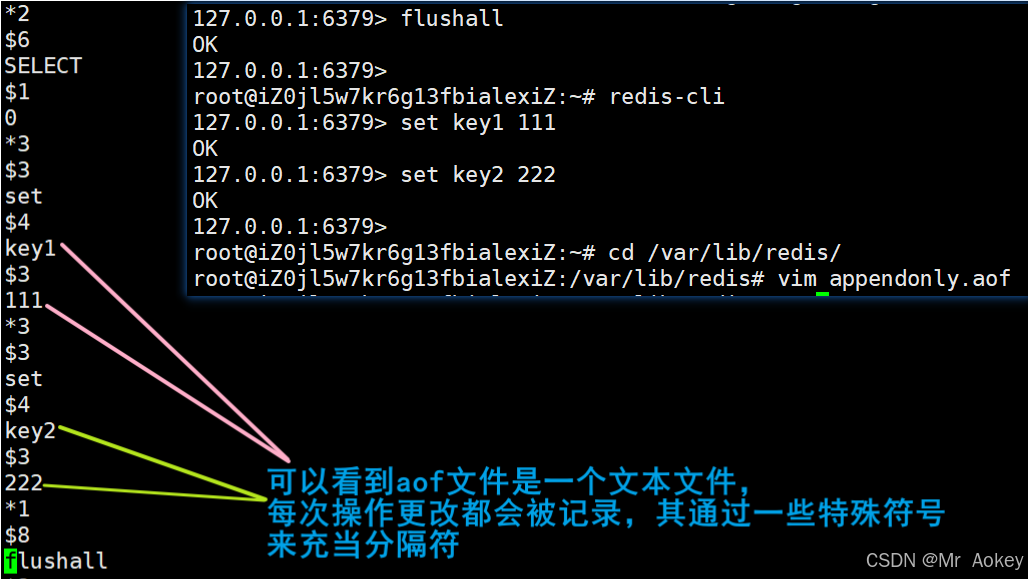 注意:开启AOF后,RDB就不生效了,启动的时候不再读取RBD文件内容,而是读取上图aof文件内容进行数据的恢复。