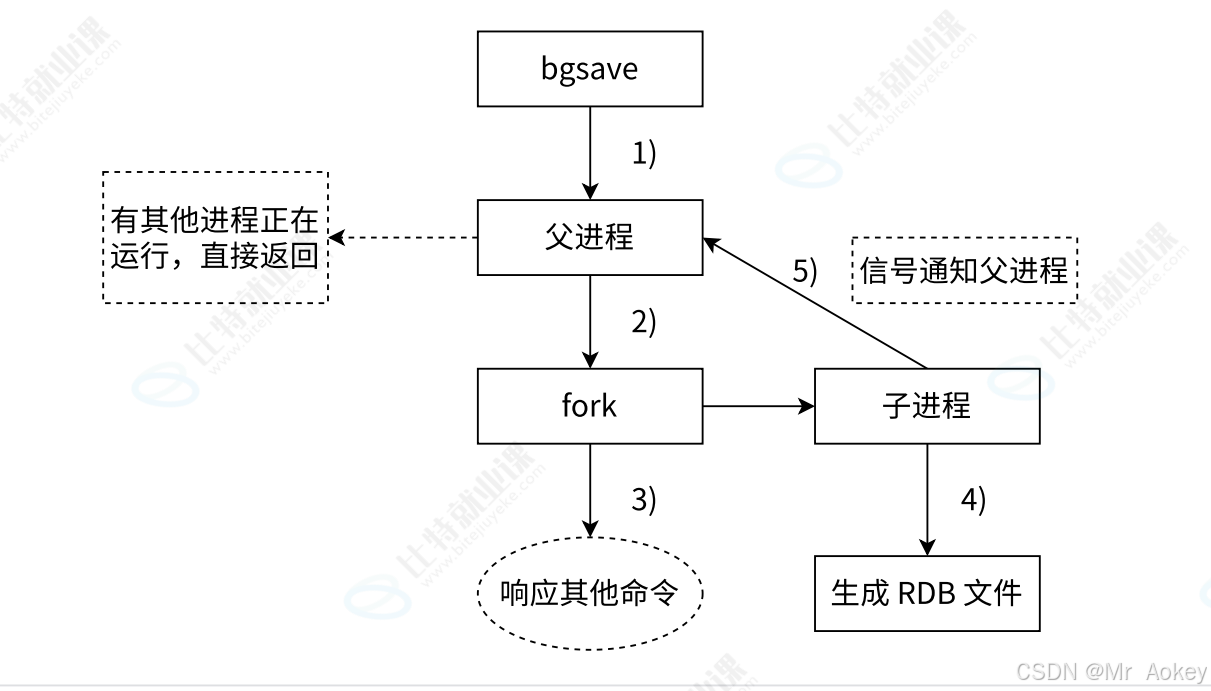 执行bgsave命令,会先判断是否有其他进程在执行 fork ,没有的话,父进程会调用fork()系统调用(阻塞性操作,但速度非常短暂,微秒级别),然后就clone 一个子进程,子进程就会遍历内存中所有数据库和键值对,按照RDB文件格式,将其序列化,压缩并写入一个临时RDB文件(二进制) ,完成后对原有文件进行原子替换,最后进程发送信号给父进程表示完成。在此过程中父进程会继续响应其他命令