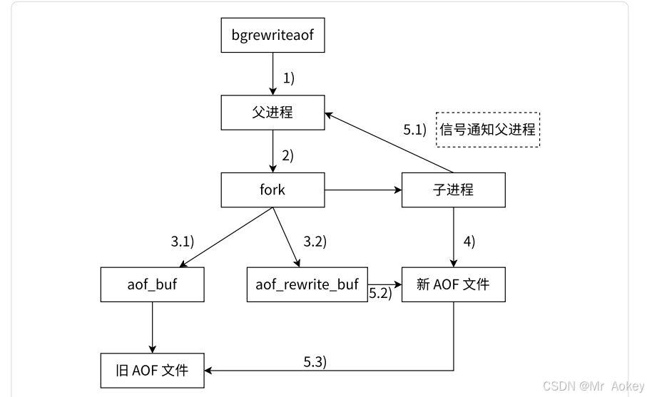 (1)父进程执行fork()操作创建一个子进程 (2),(3.1)父进程继续负责接收请求 ,(4)创建出来的子进程会获取父进程当前的内存数据 ,以AOF格式写入一个新的AOF文件中,但写入的过程中,父进程新进行的操作子进程是获取不到的 ,(3.2)父进程会把新的操作命令写入aof_rewirte_buf 内存缓冲区中 ,(5.1)等子进程把创建时内存的数据写完并通知父进程后, (5.2)父进程再把aof_rewirte_buf 内存缓冲区的数据写入新的AOF文件 ,(5.3)最后替换原来的AOF文件