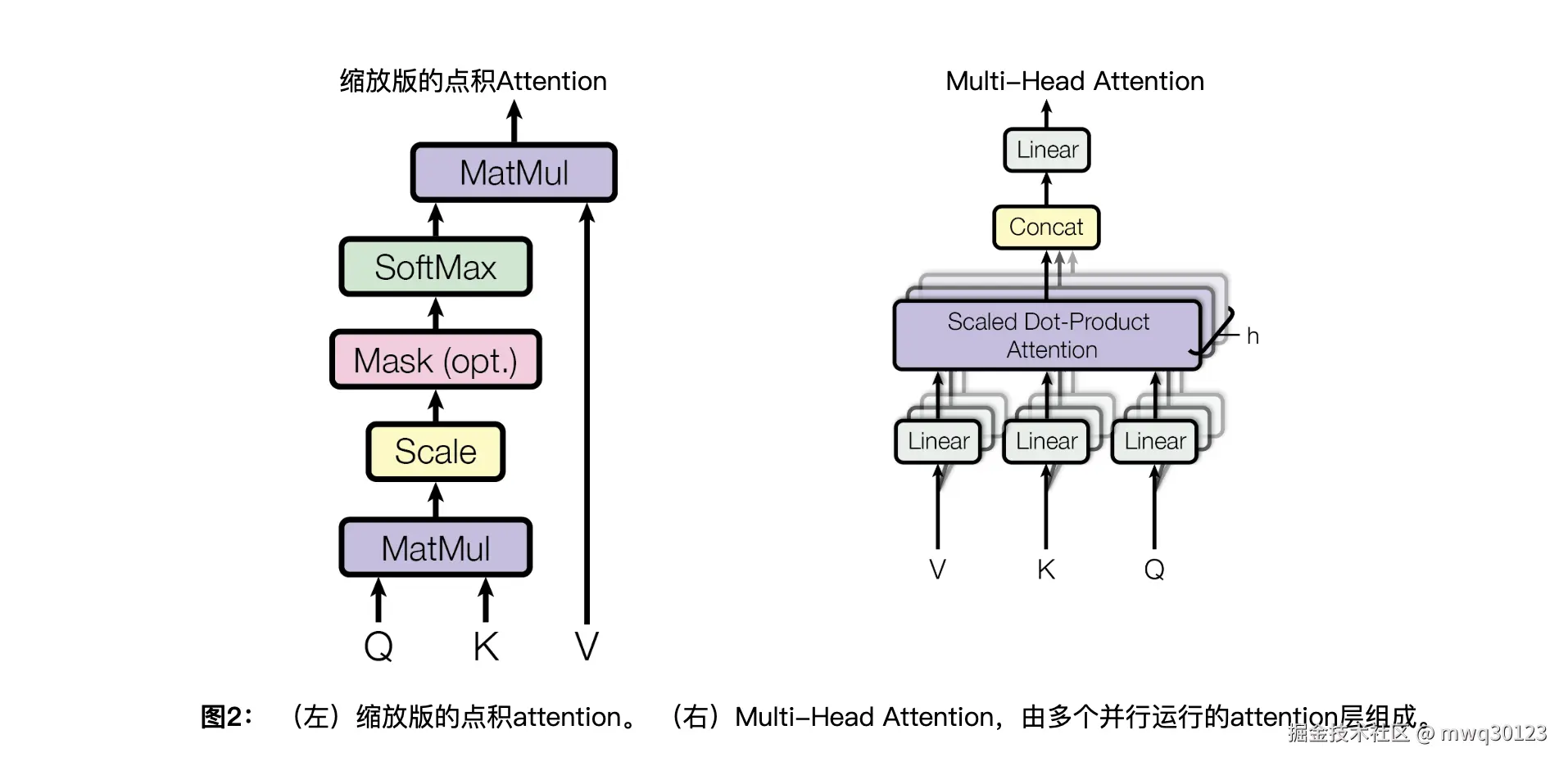 ) 计算 Q 和 K 的点积。注意,K 需要进行最后两个维度的转置。 - 缩放 (Scaling) : 将点积结果除以一个缩放因子 <math xmlns="http://www.w3.org/1998/Math/MathML"> k \sqrt{k} </math>k ,以防止梯度在 Softmax 函数中变得过小,从而稳定训练。