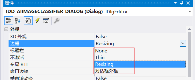 如图片所示,在VS的资源编辑器中,选中对话框主体,在右侧的属性窗口(Properties) 中,我们可以找到 Border