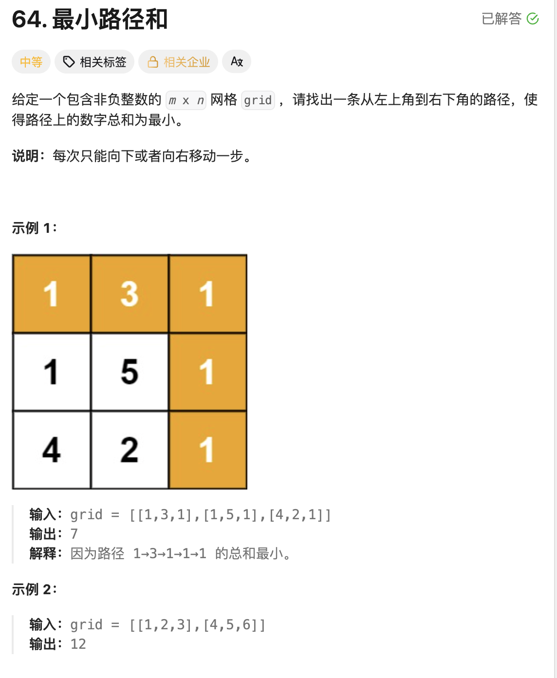 //边界情况,只有一行或者只有一列,这样就无法从左上角走到右下角,所以最小路径和为0