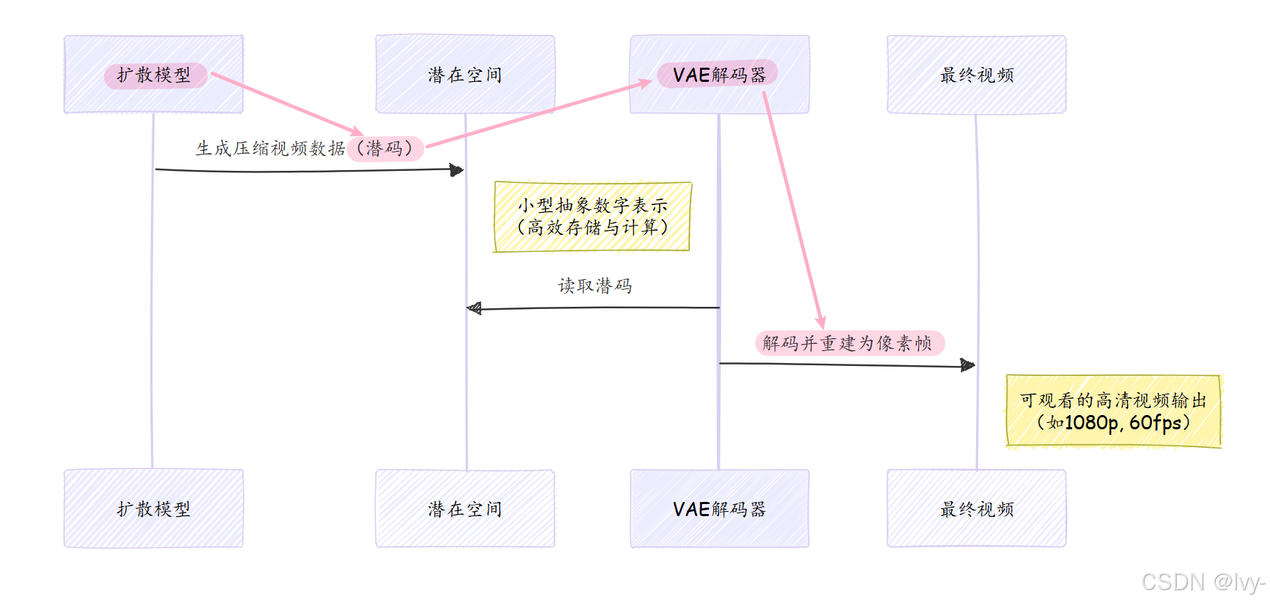 在视频生成流程中,VAE与扩散模型紧密配合: