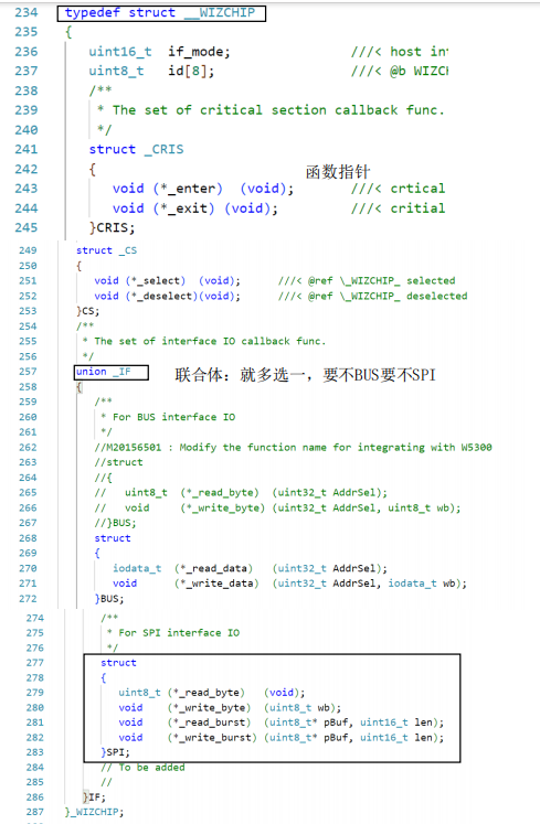 我们跳到_WIZCHIP自定义类型看看怎么个事:发现_WIZCHIP内有定义了结构体(CRIS灵临界区,CS片选,IF)这个IF用的union类型就是说下面的多个子结构体变量只能二选一来用,我们还发现的信息是全部结构体变量都是指针函数