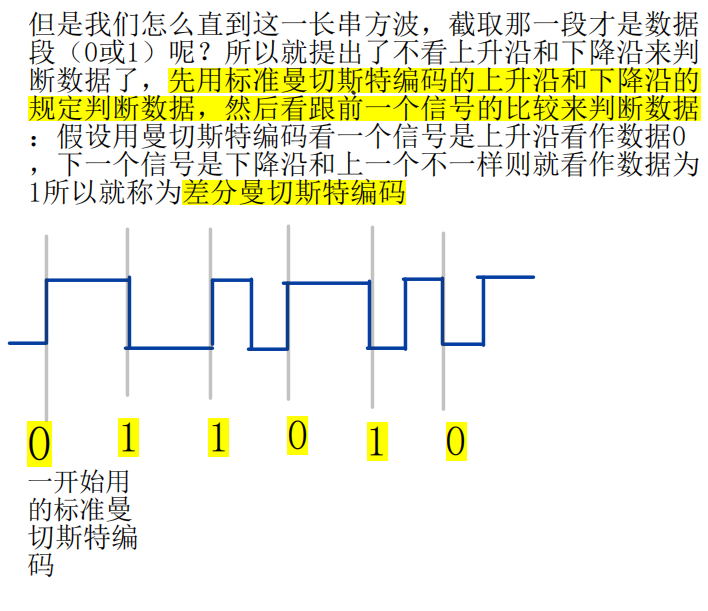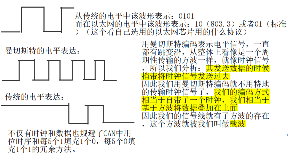 以太网如何兼顾长距离传输大量数据避免干扰:差分信号线,CAN就采用了位时序的保证时钟的一致性但是过于麻烦,而以太网则考虑到了CAN的冗余而在数据的编码表达上做创新:物理层在电缆上用跳变沿表示0或1,我们称之为曼切斯特编码,虽然比传统的电平表示的数据少,