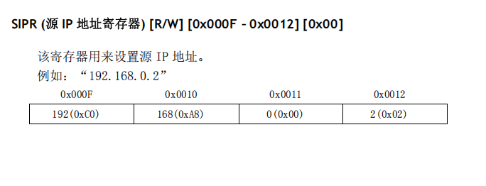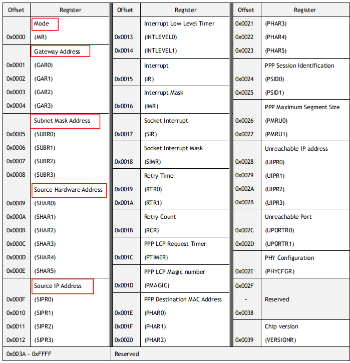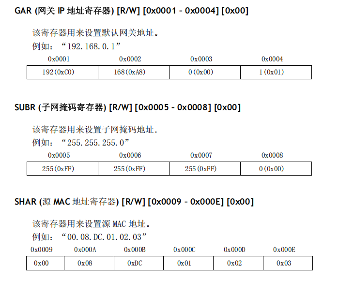 (1)1个普通寄存器block:这里配置了W5500的一些基本信息,如工作模式,网络配置(IP、MAC地址(写6个字节)、子网掩码等)。