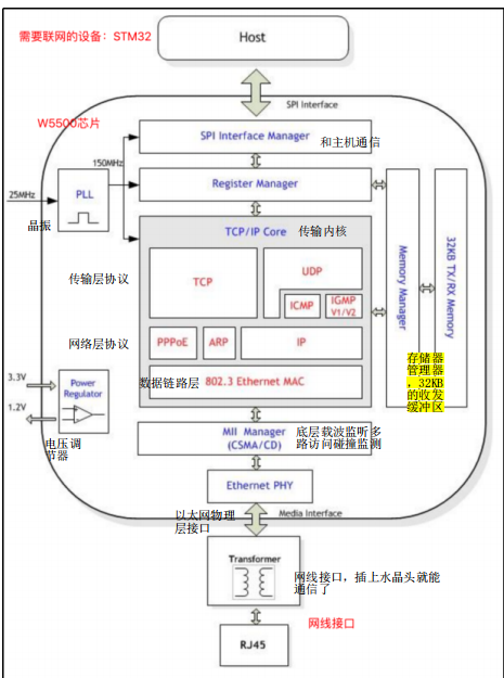 W5500集成了TCP/IP协议栈,10/100M以太网数据链路层(MAC)及物理层(PHY),使得用户使用单芯片就能够在他们的应用中拓展网络连接。