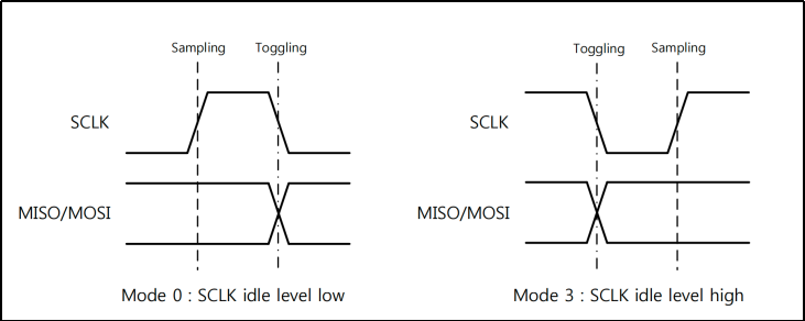 在W5500中只支持工作模式0和3,在这两种模式下数据总是在SCLK信号的上升沿做数据采样即接收数据,在SCLK信号的下降沿(发送方)做数据的翻转和(接收方)做数据的发送。