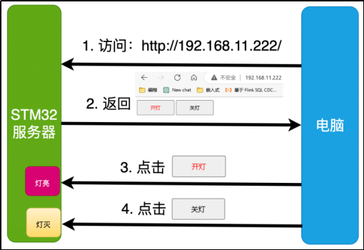 (3)当点击关灯按钮的时候,传递参数:http://192.168.11.222:80/index.html?action=2