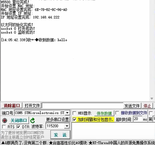 W5500控制显示图,两种方式:可变数据长度,即通过控制片选信号实现;而固定数据长度模式,则因为片选信号长期使能所以就一直接收数据。