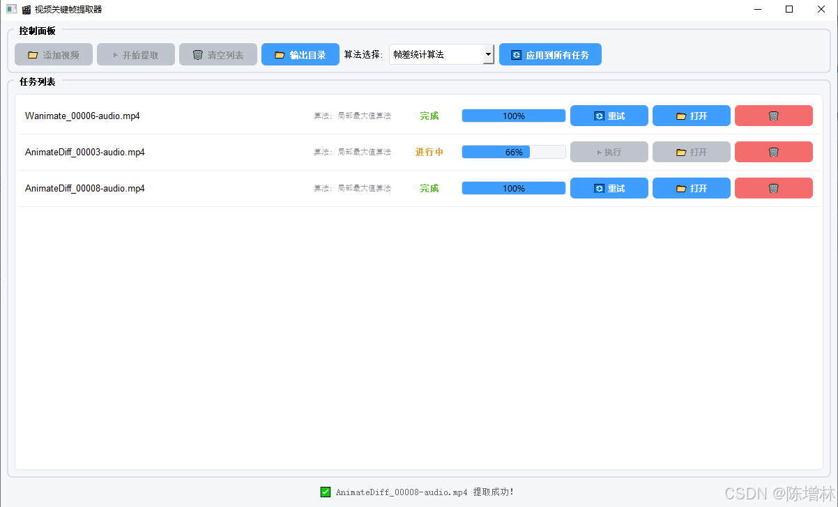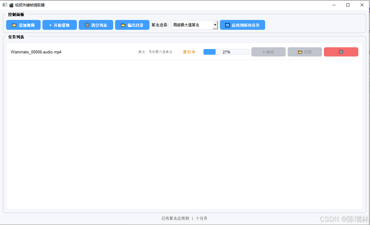 在视频处理、内容分析、剪辑预览等场景中,关键帧提取是一项基础而强大的技术。本文将带你从零构建一个支持三种主流算法、具备完整图形界面的视频关键帧提取工具,并深入解析其核心原理与实现细节。