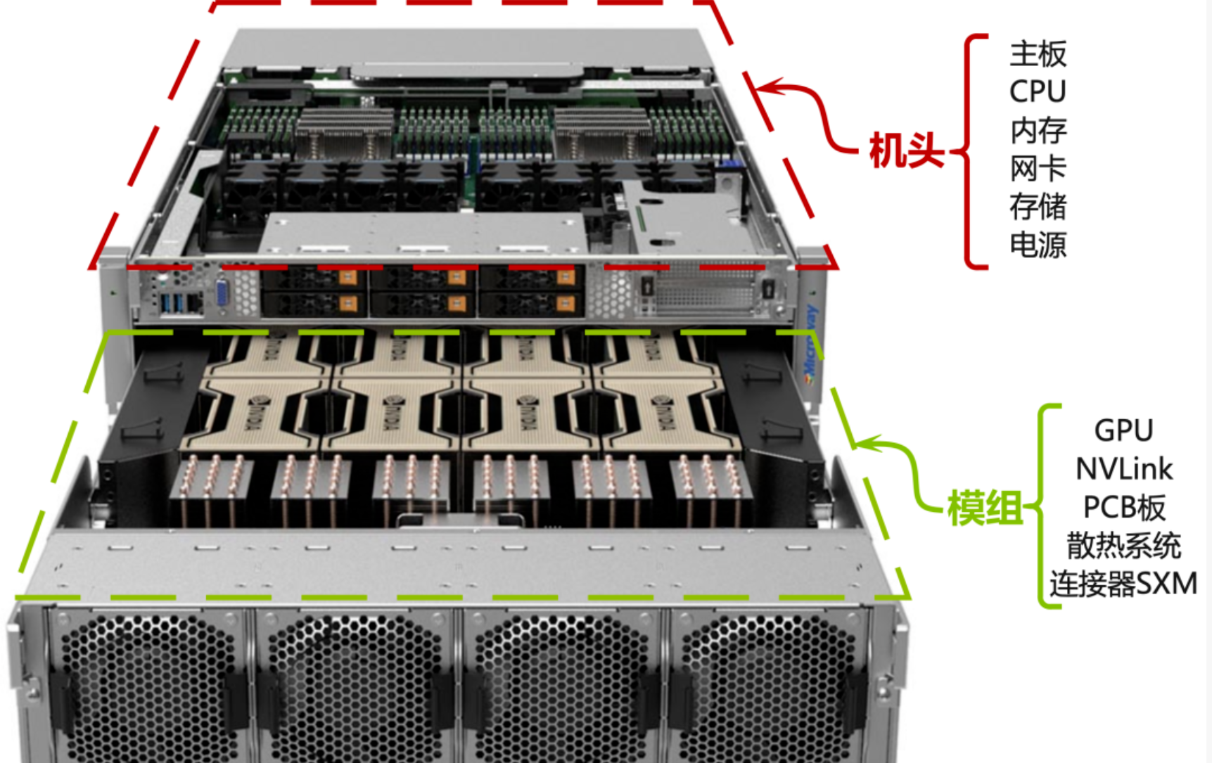 核心定义:模组是专门承载GPU和其高速互联组件的可插拔单元。一个机头可以连接多个模组,这种设计使得GPU密度最大化,并便于维护和升级。