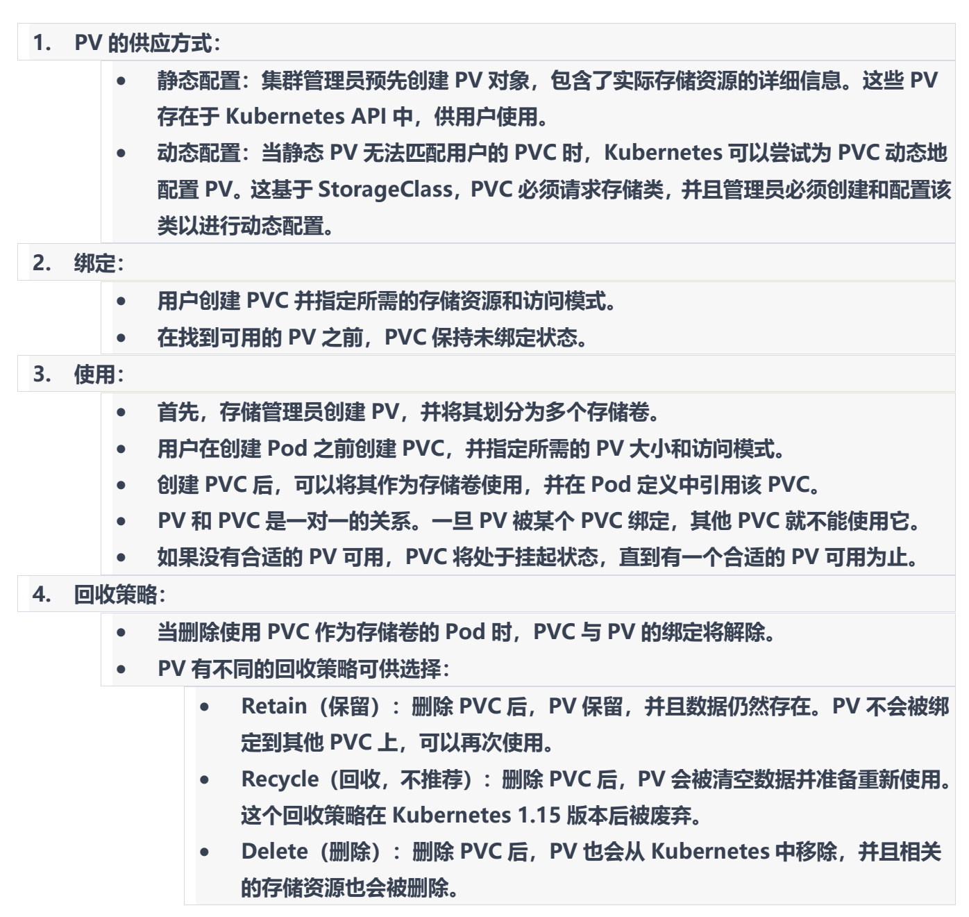 通过 PV 和 PVC 的结合使用,Kubernetes 提供了一种灵活的持久化存储管理机制,使得使得 k8s
