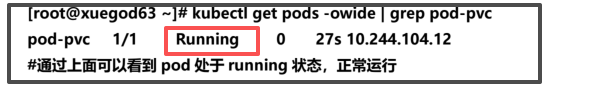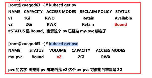 root@xuegod63 \~\]# mkdir /data/volume_test/v{1,2} -p #配置 nfs 共享宿主机上的/data/volume_test/v1..v2 目录 \[root@xuegod63 \~\]# vim /etc/exports /data/volume_test/v1 \*(rw,no_root_squash) /data/volume_test/v2 \*(rw,no_root_squash) #重新加载配置,使配置成效 \[root@xuegod63 \~\]# exportfs -arv 2、如何编写 pv 的资源清单文件 #查看定义 pv 需要的字段 kubectl explain pv **pv.yaml 配置文件** apiVersion: v1 kind: PersistentVolume metadata: name: v1 labels: app: v1 spec: capacity: storage: 1Gi accessModes: ["ReadWriteOnce"] nfs: path: /data/volume_test/v1 server: 192.168.1.63 --- apiVersion: v1 kind: PersistentVolume metadata: name: v2 labels: app: v2 spec: capacity: storage: 2Gi accessModes: ["ReadWriteMany"] nfs: path: /data/volume_test/v2 server: 192.168.1.63 3、创建 pv #更新资源清单文件 kubectl apply -f pv.yaml #查看 pv 资源 kubectl get pv --show-labels 4、创建 pvc,和符合条件的 pv 绑定 pvc.yaml 配置文件 apiVersion: v1 kind: PersistentVolumeClaim metadata: name: my-pvc spec: selector: matchLabels: app: v2 accessModes: ["ReadWriteMany"] resources: requests: storage: 2Gi #更新资源清单文件 kubectl apply -f pvc.yaml #查看 pv 和 pvc kubectl get pv kubectl get pvc  5、创建 pod,挂载 pvc vim pod_pvc.yaml apiVersion: v1 kind: Pod metadata: name: pod-pvc spec: containers: - name: nginx image: nginx imagePullPolicy: IfNotPresent volumeMounts: - name: nginx-html mountPath: /usr/share/nginx/html volumes: - name: nginx-html persistentVolumeClaim: claimName: my-pvc #更新资源清单文件 \[root@xuegod63 \~\]# kubectl apply -f pod_pvc.yaml #查看 pod 状态 # kubectl get pods -owide | grep pod-pvc  测试 pod 挂载 PVC 是否正常: 在绑定的 v2 目录下创建文件,写入测试内容"my-pvc" \[root@xuegod63 \~\]# echo "my-pvc" \>\> /data/volume_test/v2/index.html \[root@xuegod63 \~\]# curl 10.244.104.12 my-pvc 测试删除 pod,再重新创建 pod ,挂载原先的 pvc,看数据是否会丢失: \[root@xuegod63 \~\]#kubectl delete -f pod_pvc.yaml \[root@xuegod63 \~\]#kubectl apply -f pod_pvc.yaml \[root@xuegod63 \~\]# kubectl get pods -owide \| grep pod-pvc pod-pvc 1/1 Running 0 27s 10.244.104.13 \[root@xuegod63 \~\]# curl 10.244.104.13 my-pvc pod 重新挂载到原 pvc,数据还在