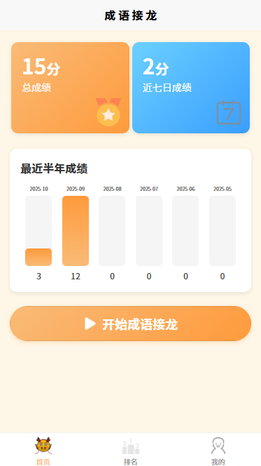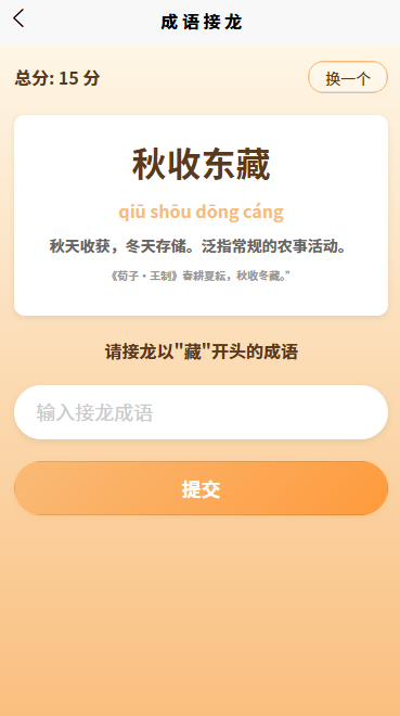 2.输入随机生成的成语最后一个字作为开头并且回答一个有效的成语算作回答正确,获得1分。