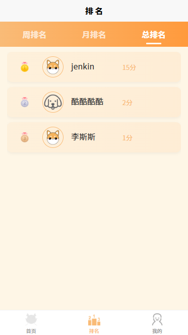 首页主要展示个人的成绩,总成绩和近七日,近半年成绩
