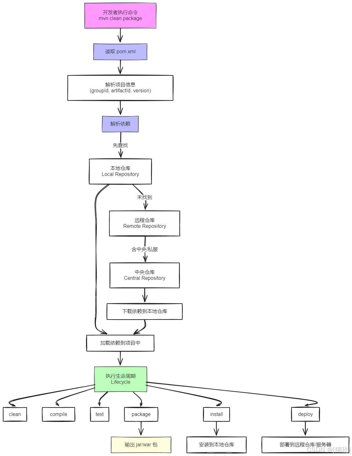 生命周期管理 | 控制项目从构建到发布的整个流程 | compile → test → package → install → deploy |
