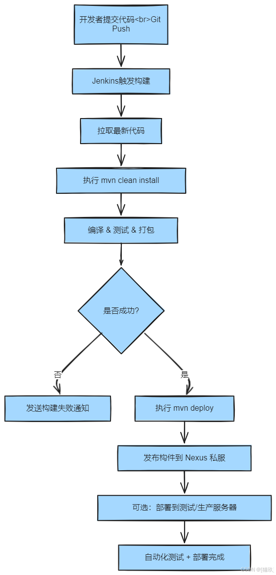 Jenkins 自动拉取 Git 代码 → 调用 Maven 进行构建测试 → 打包产物(jar/war)→