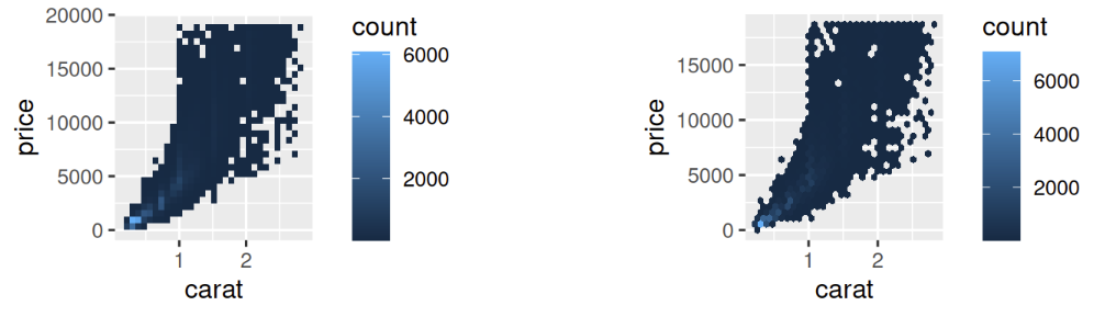 创建六角形 bins。 您将需要安装 hexbin 软件包以使用 geom_hex()