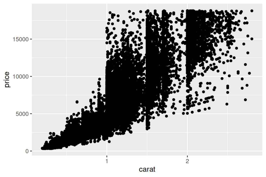 绘制散点图。 您可以将协方差视为散点中的一种模式。 例如,您可以看到钻石的克拉尺寸(carat)和价格(price)之间的正相关关系:具有更大克拉尺寸(carat)的钻石价格(price)更高。 关系是指数级的。