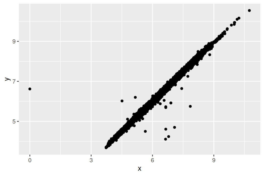 值显得正常,也使得散点异常。 为什么在这种情况下,scatterplot 比 binned plot 更好?diamonds |> filter(x >= 4) |> ggplot(aes(x = x, y = y)) + geom_point() + coord_cartesian(xlim = c(4, 11), ylim = c(4, 11))