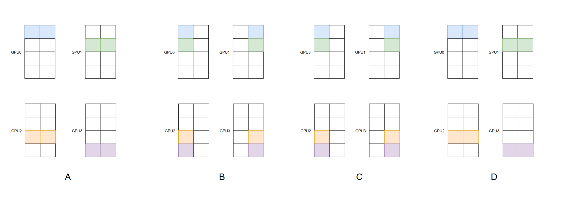初始状态为A,每个GPU拥有一个Q block的所有head。