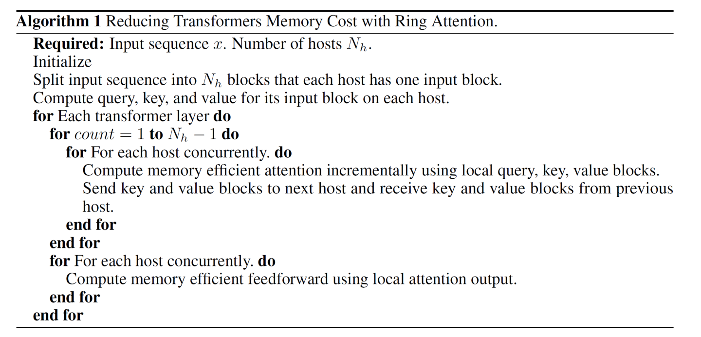 通过序列并行,每个卡保存原始Q的一个block Qi和对应的KVi,所有卡组成一个环,当rank[i]计算Qi的attention时,同时将自己的KV发送给rank[next],并从rank[prev]获取KV,理想场景下KV的通信和单卡计算attention可以overlap。伪代码如下