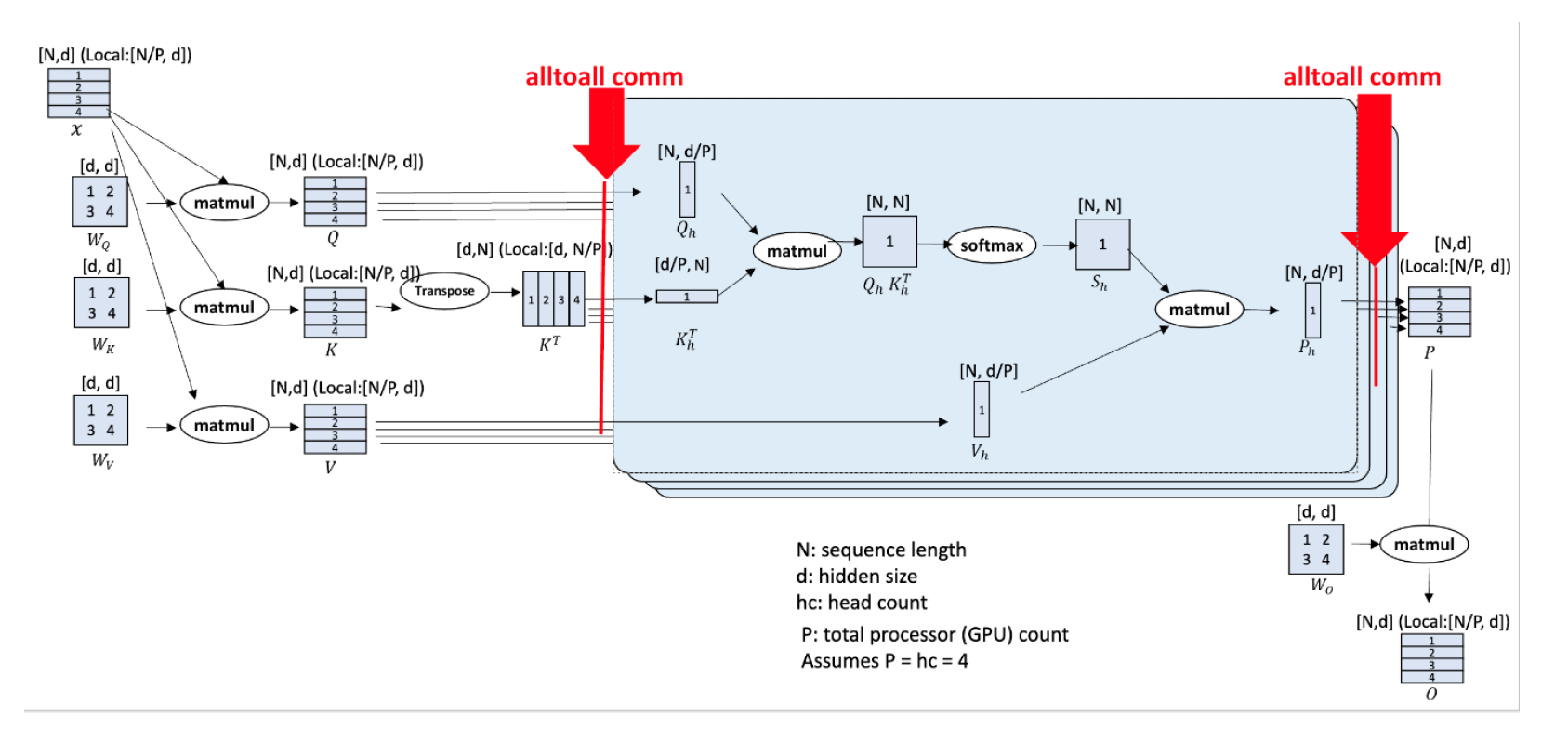 输入X的shape为[N, d],按照序列并行切分到所有的GPU,一个GPU对应的X维度为[N / P, d]。ulysses不对模型做切分,每张卡保存所有完整模型,即Wq,Wk,Wv,维度均为[d, d],因此每张卡可以独立计算得到QKV分块,shape均为[N / P, d]。然后开始对QKV分块分别执行all2all,此时每张卡维护的Q的shape为[N,d / P],相当于一张卡维护了整个序列对于部分head的结果,因此Ulysses的缺点很明显,扩展性限制于head数,另外all2all多机的话会引入非同号网卡的通信。