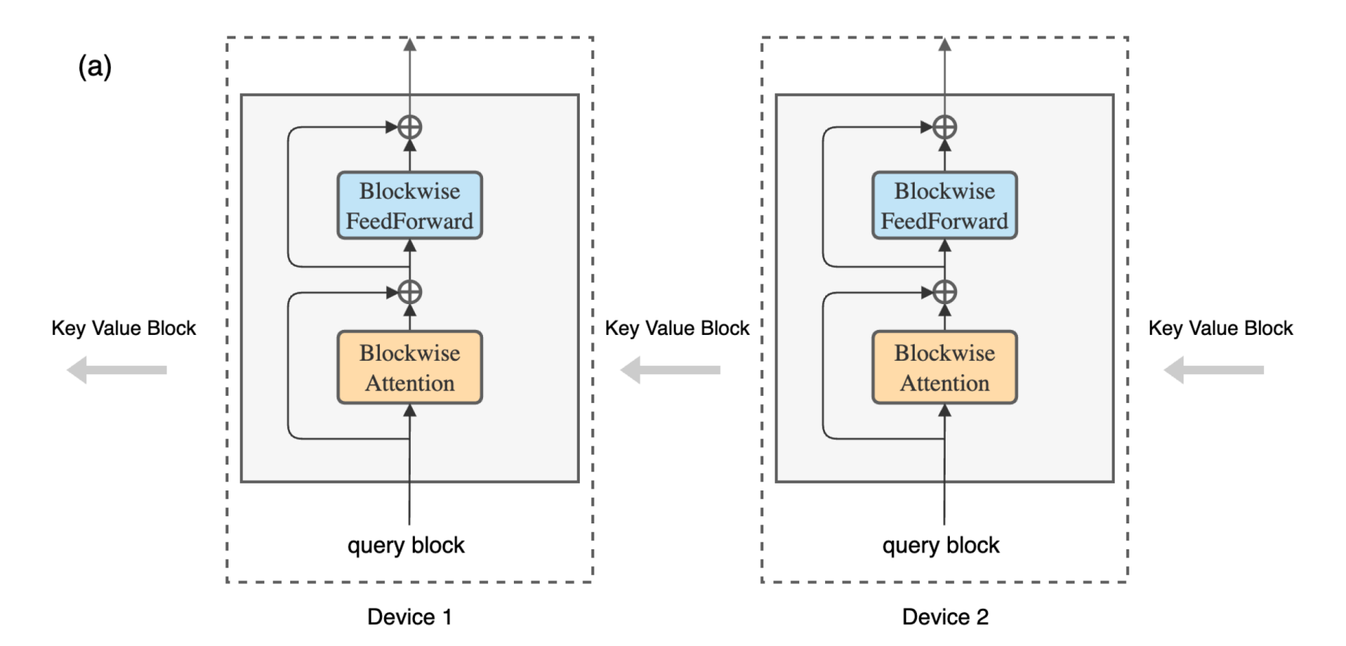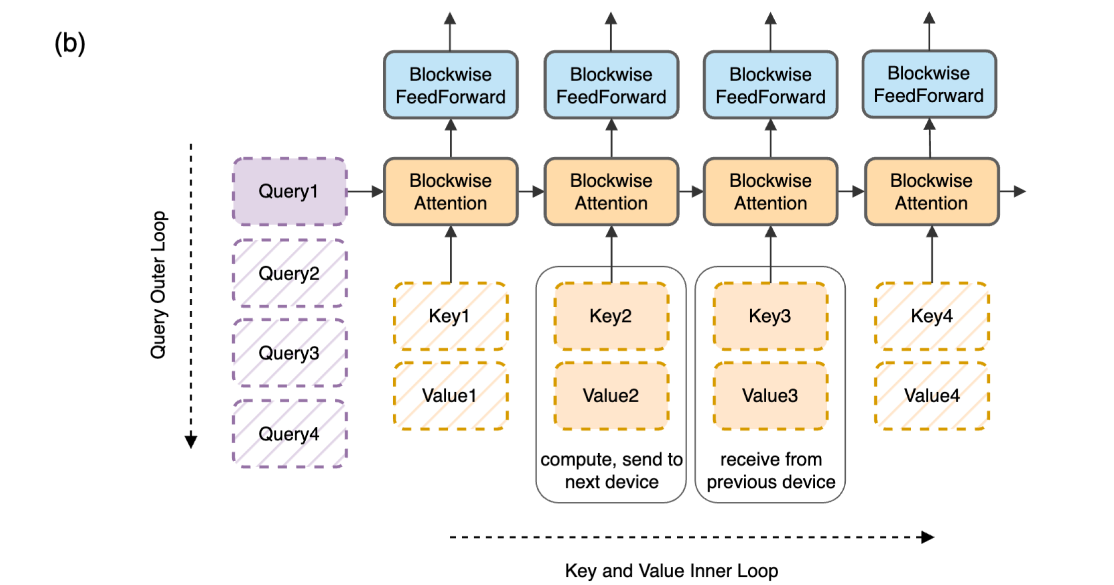 RingAttention有点像多卡版本的flash attention,如下图b所示,卡间在Q维度并发,即外层循环。