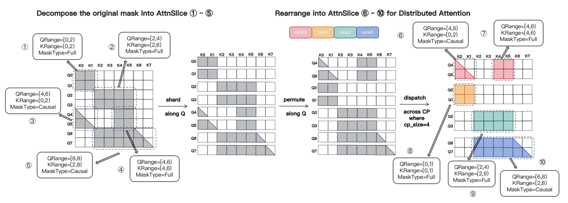 对于复杂mask的场景,原生fa支持有限,sandai的做法是将mask切分为(Qrange, Krange, MaskType)组成的AttnSlice,如下图所示