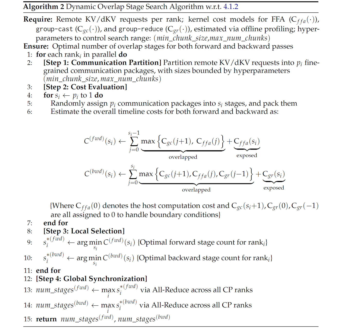 对于stage的选择,sandai也设计了一个搜索算法,假设离线已经知道了通信和计算的耗时,然后对remote KV/dKV进行切分为候选的stage集合比如为数组pi[],pi[x]表示rank[i]的第x个候选stage,然后每个rank遍历各自的pi,通过离线的耗时计算每个候选stage的耗时,选择出最小的称为Si,然后选出全局最大的Si成为最后的stage。