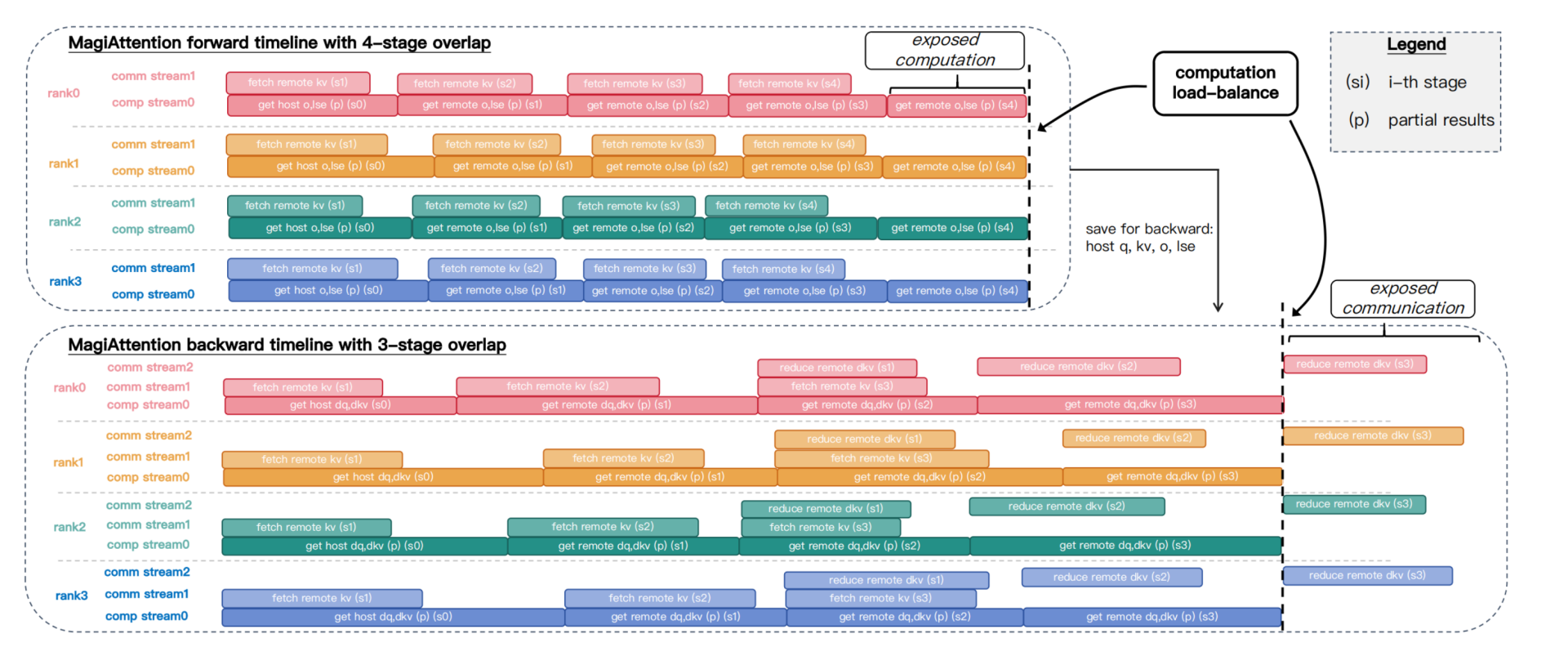 在零冗余的通信算子基础上,sandai设计了通信计算overlap的multi-stage方案,每个rank将remote KV/dKV分块为多个stage,如下图所示,前向为4-stage,反向为3-stage。